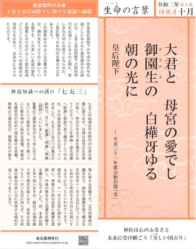 前月 ek0901.hatenablog.com 令和 二 年 庚子歳 神無月 十月 『 命の言葉 』 神社は心のふるさと 未来に受け継ごう 「美(うるわ)しい国ぶり」 皇后陛下 大君の 母宮の愛でし御園生(みそのふ)の 白樺冴ゆる朝の光に 皇后陛下― 平成三十一年歌会始お題「光」…